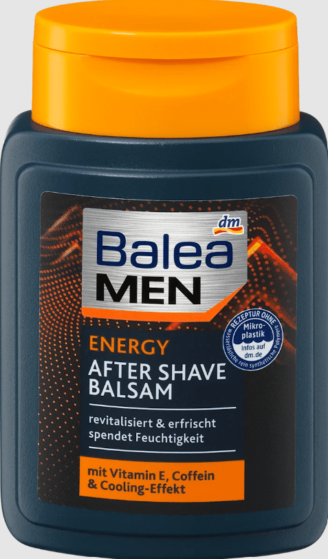 Balea MEN balzamas po skutimosi Energy su vitaminu E ir kofeinu suteikia naujos energijos pavargusiai odai. Jis ramina įtemptą vyrų odą ir turi drėkinamąjį bei gaivinantį poveikį. Balzamas suteikia gaivią, gyvybingą išvaizdą. Taip pat greitai susigeria nepalikdamas riebių likučių.” *Pakuotėje yra ne mažiau kaip 70% perdirbto turinio