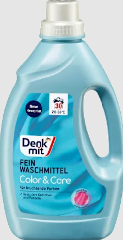 Švelnus skalbimo losjonas Denkmit švelniai valo jautrią tekstilę. „Color&Care“ priežiūros kompleksas patikimai sumažina pleiskanojimą, išlygina įtemptus pluoštus ir taip pat apsaugo spalvas. Be to, šaltai aktyvi formulė leidžia naudoti net 20°C temperatūroje, taip taupant energiją.