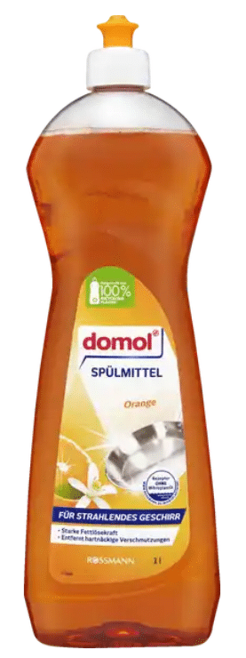 Džiaukitės spindinčiai švariais indais. Dėl galingos riebalus tirpdančios galios „domol Orange“ indų plovimo skystis akimirksniu pašalina nešvarumus.