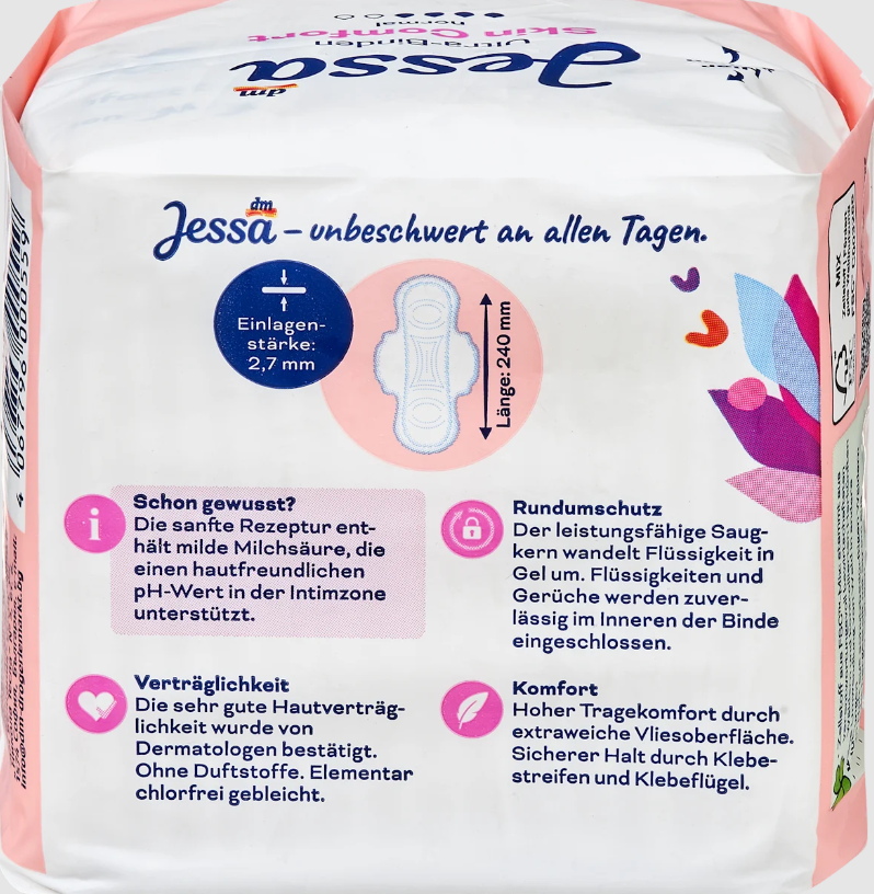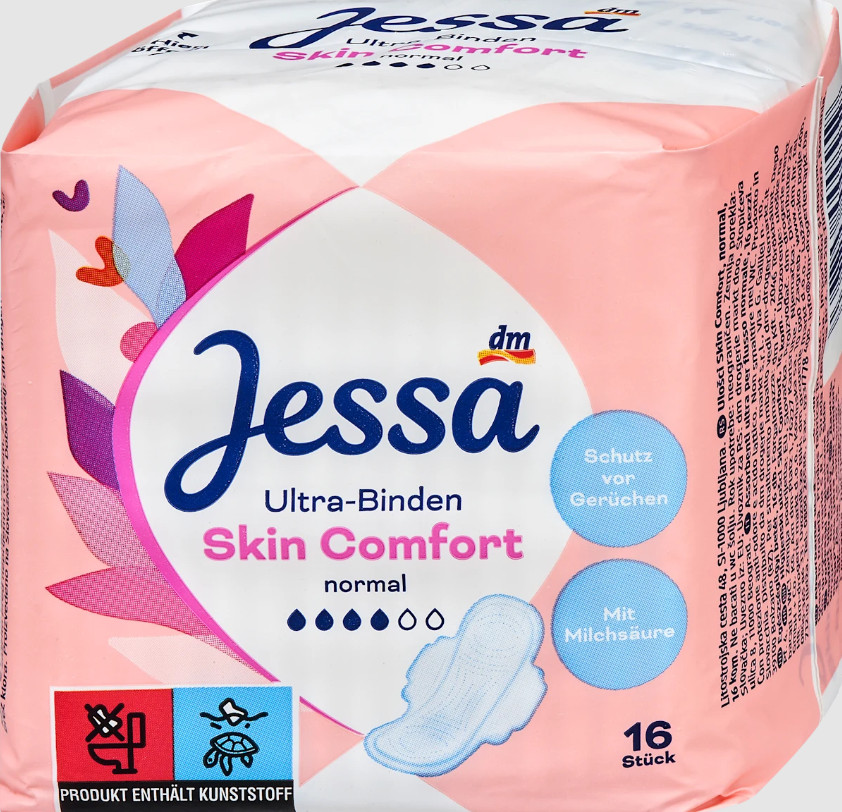 Jessa Ultra Skin Comfort įklotuose yra pieno rūgšties, kuri, kaip žinoma, palaiko odai draugišką pH vertę intymioje srityje. Itin minkštas vilnos paviršius užtikrina aukštą komforto lygį, o dvi lipnios juostelės užtikrina patikimą laikymąsi. Galingas sugeriantis šerdis greitai sulaiko skysčius ir bet kokius kvapus įkloto viduje – užtikrina ilgalaikį šviežumą.