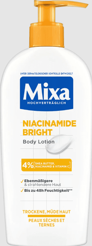 Niacinamide Bright kūno losjonas iš Mixa yra ideali priemonė sausai ir pavargusiai odai. Veikliųjų medžiagų kompleksas su taukmedžio sviestu, niacinamidu ir vitaminu C ne tik pagerina odos lygumą, bet ir padeda papildyti bei išlaikyti drėgmės lygį iki 48 valandų.