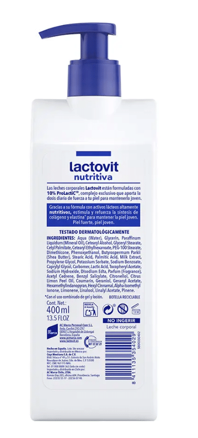 MAITINAMASIS KŪNO PIENELIS „Lactovit“. Švelnus kūno pienelis, kuris intensyviai maitina ir atkuria visų tipų, net ir sausiausios, odos švelnumą. Praturtintas taukmedžio sviestu, kuris papildomai maitina odą, be to, jame esančios laktosomų mikrokapsulės tiesiogine prasme maitina ją, kad ji būtų sveika, elastinga ir sudrėkinta. Tepkite po dušo ar vonios ant sausos odos, tolygiai paskirstykite per visą kūną švelniai masažuodami, kol visiškai įsigers. Idealiai tinka visai šeimai ir visiems odos tipams.