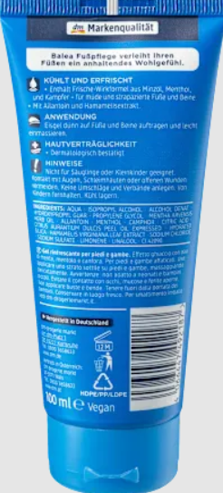 Balea pėdų ir kojų ledo gelis suteikia pėdoms ilgalaikį geros savijautos jausmą. Dėl šviežios aktyvios formulės, pagamintos iš mėtų aliejaus, mentolio ir kamparo, gelis turi vėsinantį ir gaivinantį poveikį. Alantoino ir hamamelio ekstraktas lepina pavargusias ir įtemptas pėdas.
