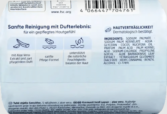 Kietas kreminis muilas Sensitive užtikrina švelnų valymą ir kvapnų potyrį. Švelni priežiūros formulė su alavijo ekstraktu ir švelniai maitinančiu kvapu palaiko natūralų odos drėgmės balansą. Išpuoselėtai odos pojūčiui. Receptas be mikroplastiko ir vandenyje tirpių, grynai sintetinių polimerų.