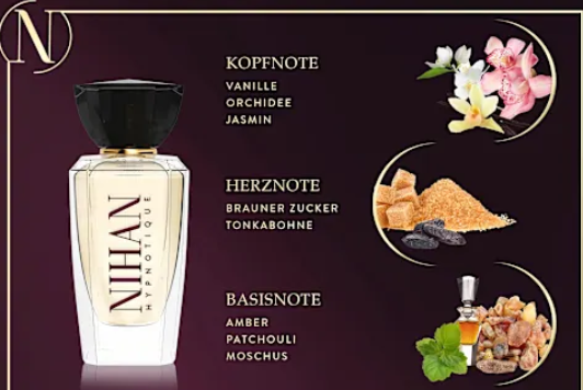 NIHAN „Hypnotique Eau de Parfum“ – tai viliojantis ir žavus aromatas. Harmoninga švelnios vanilės, jausmingo muskuso ir tamsių tongapupių kompozicija susitinka su rytietiškais prieskoniais ir šiltais medienos akordais. Subtilūs gėlių atspalviai suteikia kvepalams elegantiško lengvumo, o auksiniai buteliuko akcentai pabrėžia nesenstantį aromato grožį.