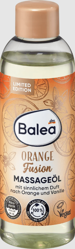 Balea Orange Fusion masažo aliejus palieka odą elastingą ir švelnią. Taip pat ant odos palieka jausmingą apelsinų ir vanilės kvapą. Aliejaus formulė su migdolų ir vynuogių kauliukų aliejumi užtikrina raminantį masažą. Receptas be mikroplastiko ir vandenyje tirpių, grynai sintetinių polimerų.