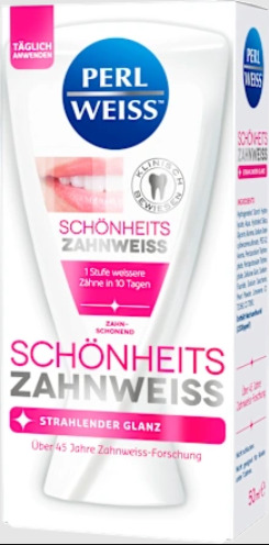 Perlweiss grožio dantų baliklis padeda patikimai ir švelniai pašalinti kasdienes apnašas ir spalvos pakitimus. Unikali Perfect White formulė su perlų pudra iš Azijos gėlavandenių perlų padaro dantis vienu lygiu baltesnius vos per 10 dienų ir suteikia jiems spindesio. Tuo pačiu metu esantis fluoras stiprina dantų emalį ir apsaugo nuo ėduonies. Dantų pastos formulė yra be titano dioksido.