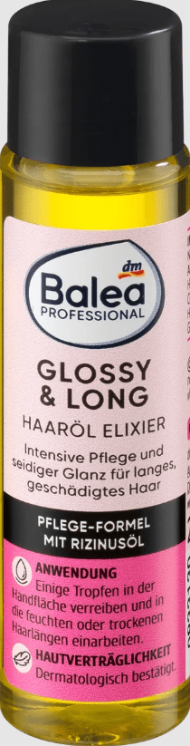 Elixir Glossy & Long plaukų aliejus iš Balea Professional ypač tinka ilgiems, pažeistiems plaukams. Priežiūros formulė su ricinos aliejumi intensyviai maitina plaukus ir suteikia jiems šilkinio žvilgesio.