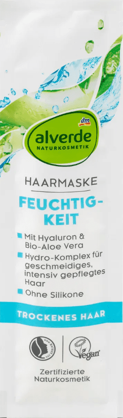 Alverde NATURKOSMETIK drėkinamoji plaukų kaukė buvo pritaikyta būtent sausiems ir pažeistiems plaukams. Priežiūros formulė su kokosų, simondsijų ir sojų aliejais iš sertifikuoto ekologinio ūkininkavimo ir drėkinimo kompleksu, pagamintu iš hialurono rūgšties, organinio alavijo ir augalinės kilmės glicerino, maitina plaukus, išlygina pažeistą plaukų paviršių ir gali užkirsti kelią išsausėjimui. Receptas be mikroplastiko ir vandenyje tirpių, grynai sintetinių polimerų.
