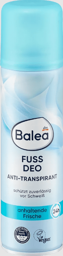 Purškiamas pėdų dezodorantas Balea efektyviai apsaugo nuo prakaito ir nemalonaus kvapo 24 valandas. Praktiškas dezodorantas suteikia gaivumo jausmą ir vėsina. Receptas be mikroplastiko ir vandenyje tirpių, grynai sintetinių polimerų.
