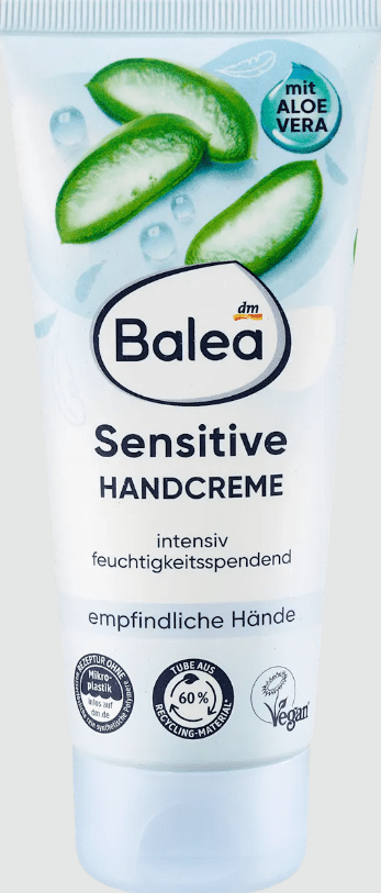 Balea Sensitive rankų kremas idealiai tinka sausai odai. Kremas specialiai pritaikytas jautrios odos poreikiams. Kompozicija su alavijais ir glicerinu intensyviai drėkina 24 valandas ir lepina odą. Visiškai išpuoselėtoms rankoms. Receptas be mikroplastiko ir vandenyje tirpių, grynai sintetinių polimerų.