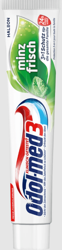 Odol-med3 „Mint Fresh“ dantų pasta yra kliniškai patikrinta ir stebina savo apsauga „trys viename“, skirta visai šeimai. Su 24 valandas veikiančiu apsauginiu skydeliu dantų pasta gali ilgą laiką apsaugoti jūsų dantis nuo cukraus rūgšties atakų. Be apsaugos, dantų pasta gali sustiprinti dantų emalį ir atgaivinti kvapą dėl mėtų skonio. Kad burnos pojūtis būtų švarus ir gaivus.