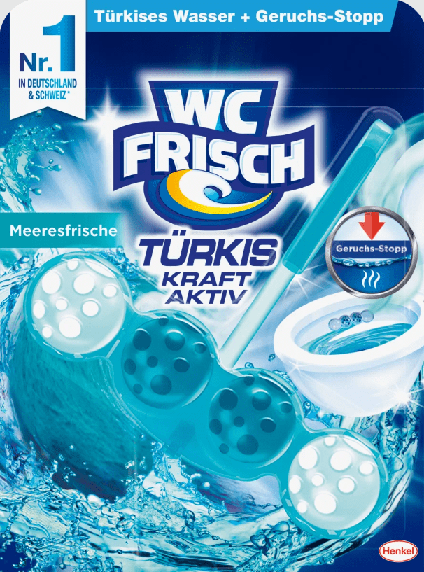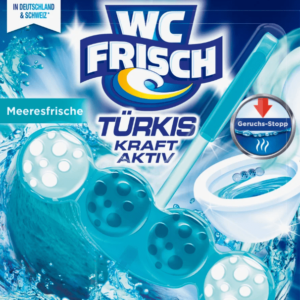 WC-Frisch Kraft Aktiv turkio skalavimo jūros gaivumas užtikrina matomą valymą turkio spalvos vandeniu ir +50% blizgesį. Su šiuo specialios spalvos skalavimu visada galėsite užtikrinti ypatingą vonios kambario higieną
